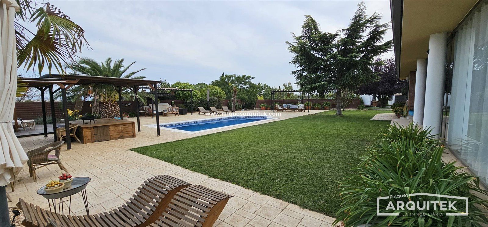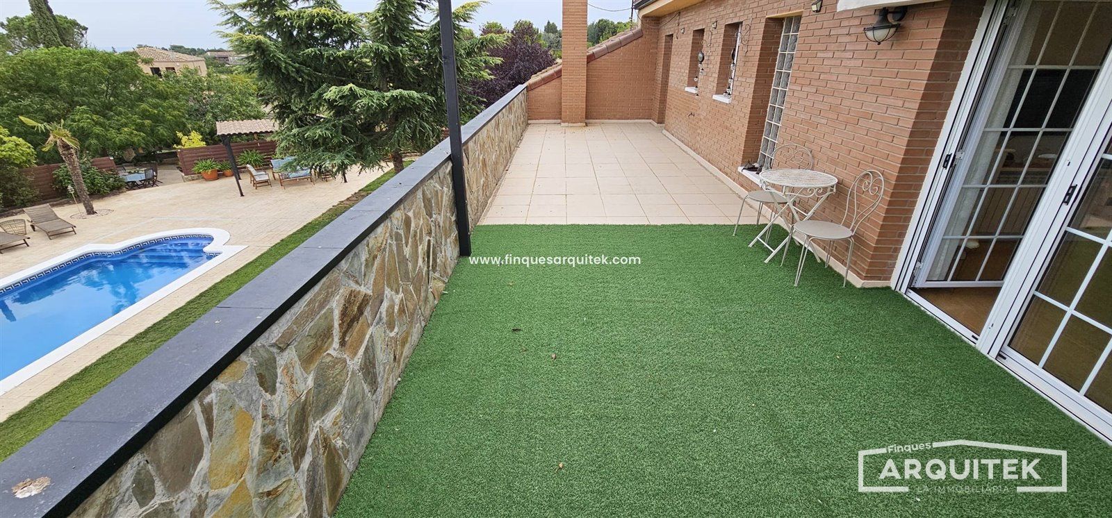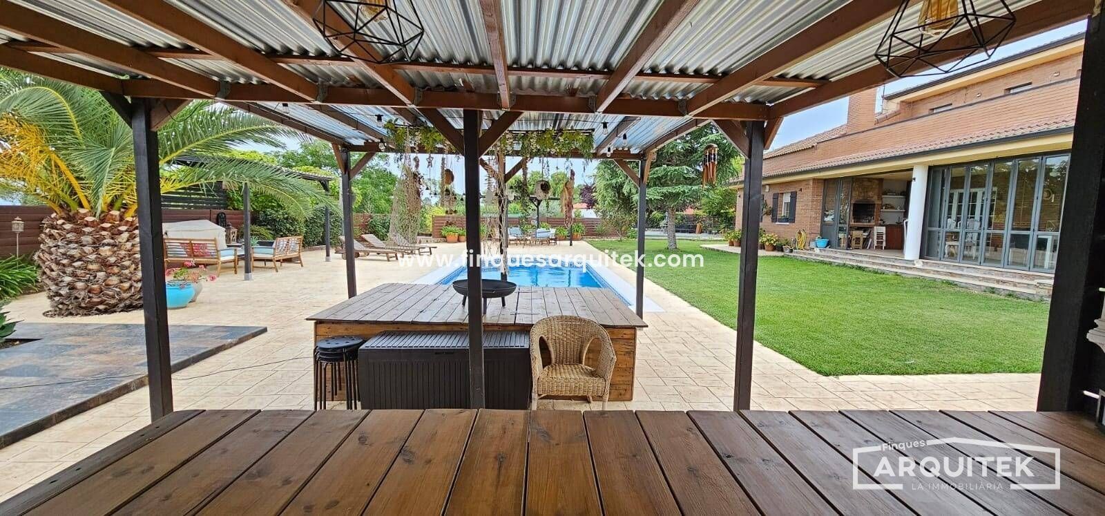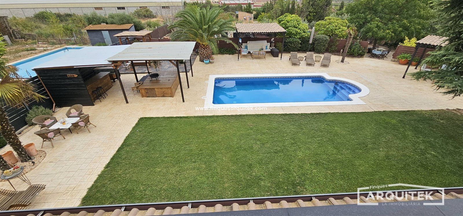 Exterior de Lujo, con piscina, zona bar, zona barbacoa, zona de almacenaje, incluso una casa de invitados, rodeados de árboles, combinación de césped natural y artificial y hormigón impreso. No te preocupes, hay poco mantenimiento, y riego automático en toda la parcela.