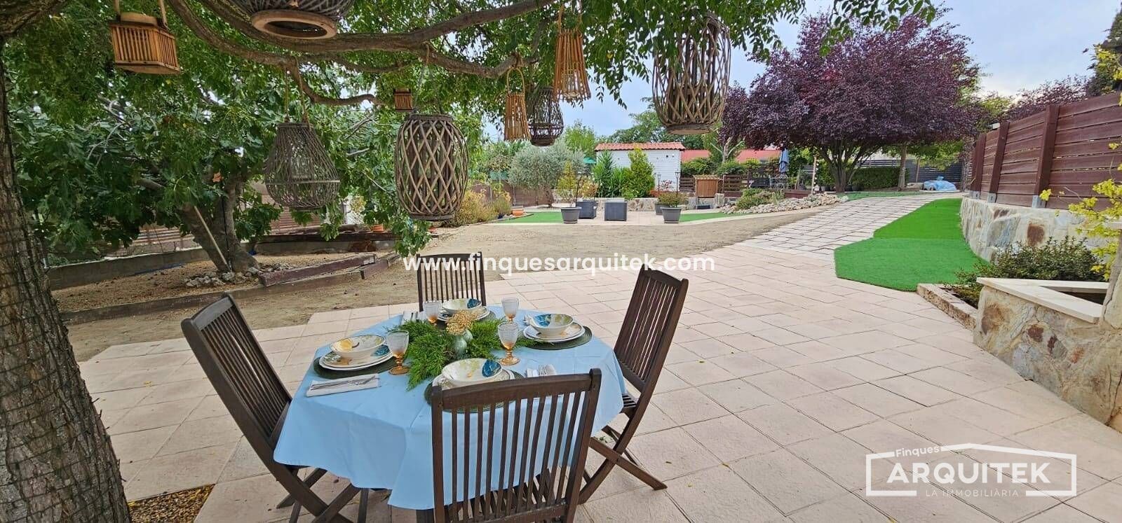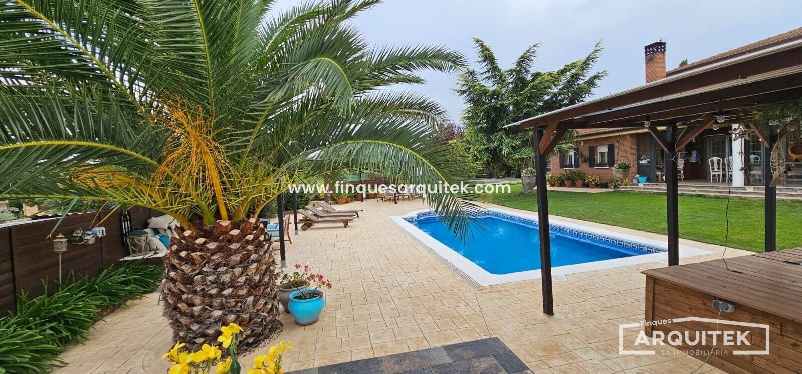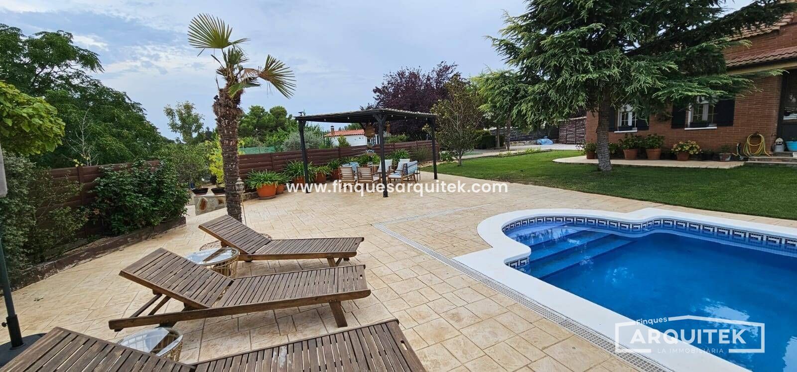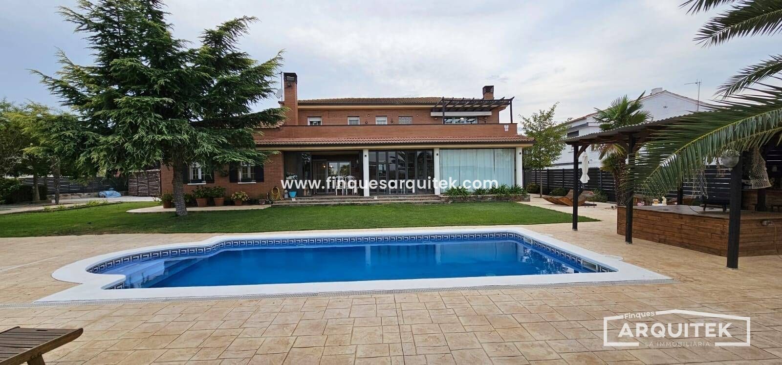 Exterior de Lujo, con piscina, zona bar, zona barbacoa, zona de almacenaje, incluso una casa de invitados, rodeados de árboles, combinación de césped natural y artificial y hormigón impreso. No te preocupes, hay poco mantenimiento, y riego automático en toda la parcela.
