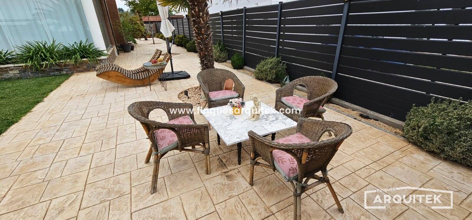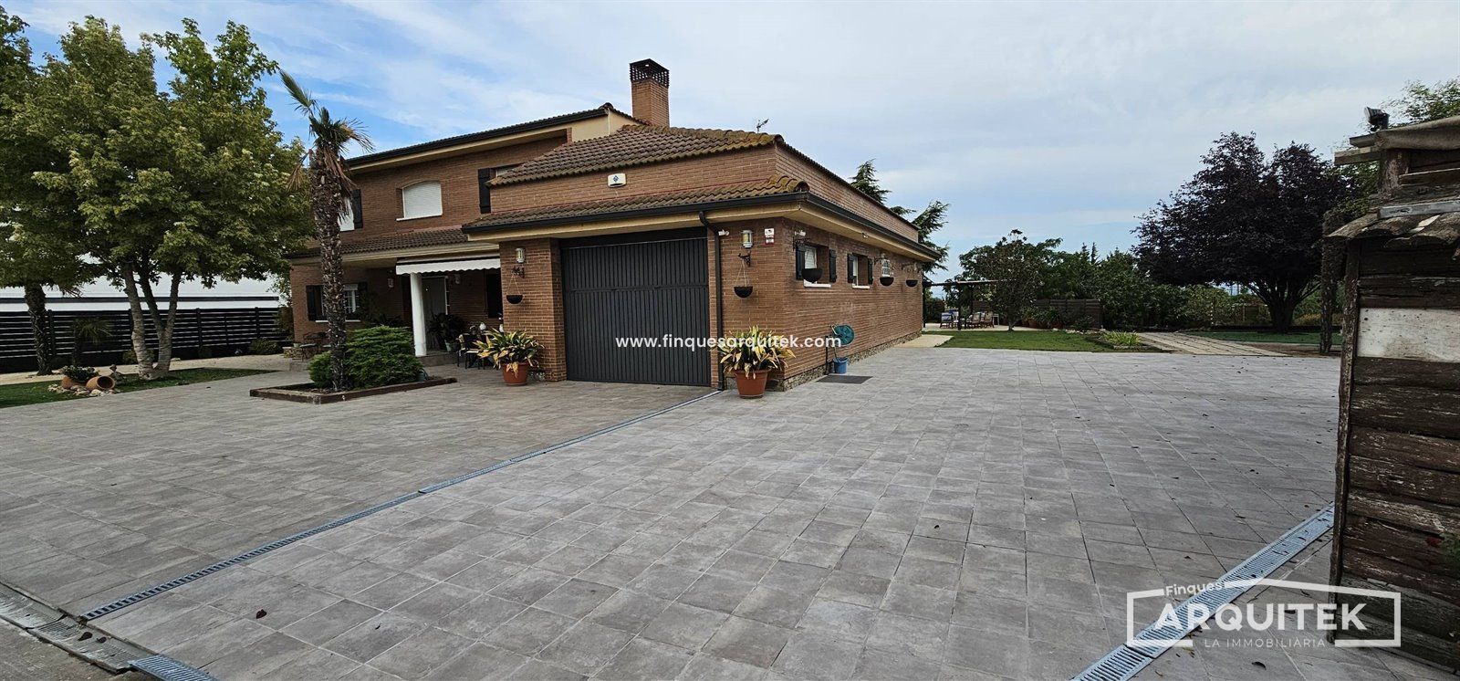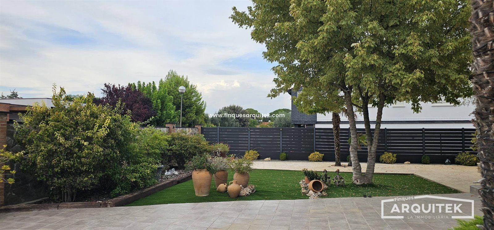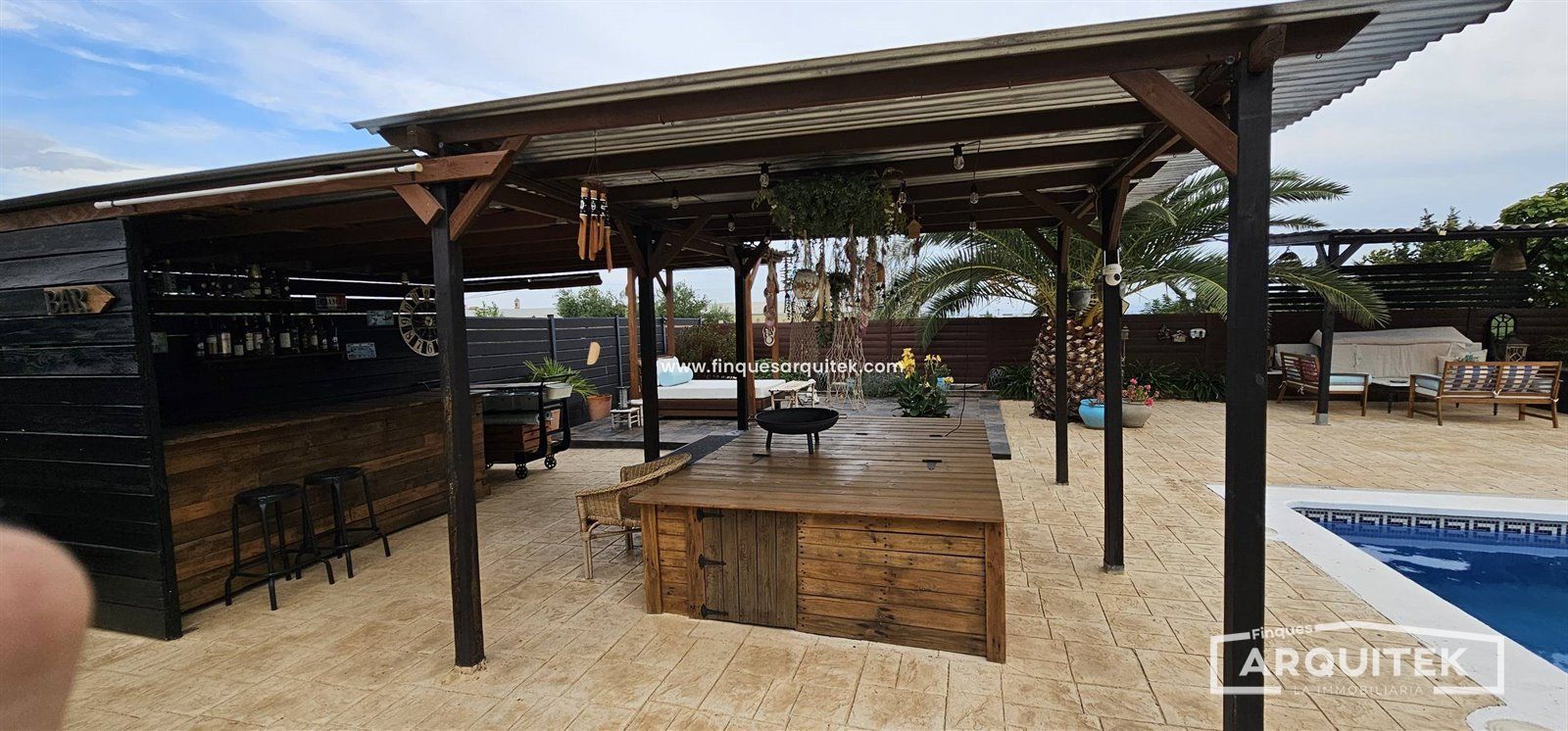 Exterior de Lujo, con piscina, zona bar, zona barbacoa, zona de almacenaje, incluso una casa de invitados, rodeados de árboles, combinación de césped natural y artificial y hormigón impreso. No te preocupes, hay poco mantenimiento, y riego automático en toda la parcela.